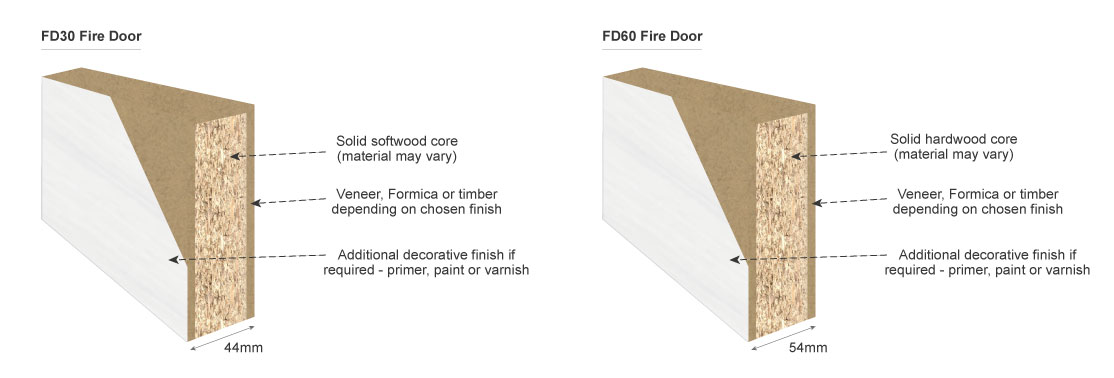 An internal fire door is a specialised door that is designed to resist the spread of fire and smoke within a building, as well as provide a clear route for escape. They are generally rated at a grade of FD30 and FD60 and are tested to withstand fire for a certain duration of time. An FD30-graded door can withstand a fire for up to 30 minutes; an FD60 door can withstand for 60 minutes.
